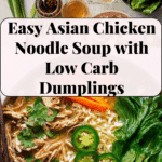This Asian Chicken Noodle Soup with Dumplings is a hearty, low-carb meal featuring tender shredded chicken, nutrient-rich vegetables, and a flavorful broth. The soup is enhanced with shirataki noodles for a low-calorie noodle substitute and almond flour dumplings that add texture and richness without traditional carbs. Perfectly seasoned with garlic, ginger, sesame oil, and soy sauce, this gluten-free, keto-friendly soup is both comforting and nourishing.