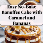 A luscious no-bake Banoffee Dessert Cake featuring layers of sweet caramel, fresh banana slices, whipped cream, and a buttery sponge or graham cracker crust, perfect for an indulgent British-inspired treat.
