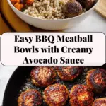 A hearty and flavorful bowl featuring tender barbecue meatballs simmered in tangy sauce, served over fluffy grains and roasted vegetables, all topped with a creamy and zesty avocado goddess sauce. Perfect for a satisfying, balanced meal.