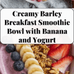 Creamy and filling, this barley breakfast smoothie bowl combines cooked barley with banana and Greek yogurt to create a fiber-rich, energizing start to your day. Sweetened with honey and spiced with cinnamon, it’s topped with fresh berries, nuts, chia seeds, and coconut for added texture and nutrition.