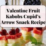 These colorful Cupid’s Arrow Fruit Kabobs feature fresh strawberries, red and green grapes, and cubed pineapple or melon, accented with marshmallow ‘arrow tips’ and heart-shaped marshmallows or strawberry halves at the ends. Perfect as a no-bake, kid-friendly snack or healthy dessert for Valentine’s Day parties and classroom gatherings.