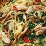 - Add Noodles: Incorporate the drained rice noodles into the pan with the chicken and vegetables, mixing well to combine.