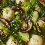 A comforting and flavorful Asian-inspired soup featuring tender frozen potstickers, earthy mushrooms, and fresh bok choy simmered together in a savory broth infused with garlic, ginger, and sesame oil.